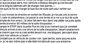 Récit :En ces jours normaux des 13 et 14 octobre 2012, où semble-t-il, rien ne venait perturber le cours normal de la vie ; la voie lactée devait être à sa place habituelle ; en admettant qu’il pleuve à Saint-Sébastien-sur –Loire , probablement la pluie dégringolait dans le sens logique des chutes , selon la loi de la gravité , sinon nous aurions tous su qu’elle tombait à l’envers, c’est-à-dire, comme si elle remontait dans le ciel ; il n’a pas non plus été signalé de panne d’horloge , de vol de soleil , ou de nouvelles météorites observées tombant sur la ville à ce moment là ; tout devait être calme et banal ; points cardinaux en ordre ; mobilité dimensionnelle idem, pollution minimale.