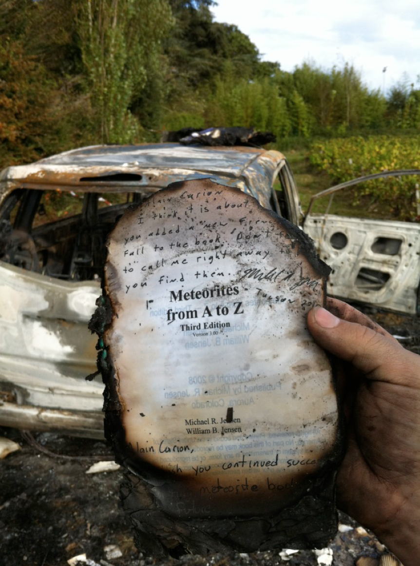 Extrait des notes du Dr. Carion . Description d’une partie du trésor.« …ma belle météorite de Gibeon 95 kg… …une drachme en argent représentant Apollon sur un amphollos… Je veux parler par exemple des bois de la Toungouska, spécimens obtenus auprès de l’université de Bologne (il y en a moins de cinq à travers le monde), un dessin de Théodore Monod, une page de la chronique de Nuremberg de 1495 avec un dessin décrivant la chute de pierres d’Ensisheim en Alsace de 1492. …toutes mes météorites de petite taille celles de la planète Mars, de la Lune, d’Ensisheim, d’Orgueil et celle de 12g de la fameuse chute de Draveil (spécimen donné par Martine Comette), plus de nombreuses autres : Celle de Juvinas, des eucrites et des howardites rares. Perdus également quatre tableaux de RAF, artiste peintre spécialisée sur l’espace et les météorites, six panneaux explicatifs conçus avec Pierre Bariand, des livres rares etc...»
