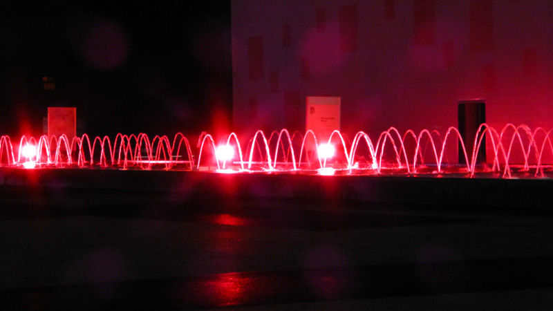 La place de la foire de nuit avec ses arceaux rouges,ses lumières blanches en fleurs diaphanes,l'indéfini des reflets.