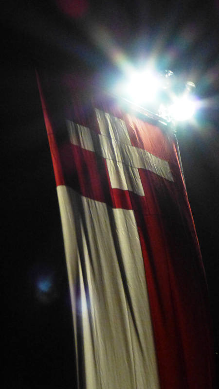 Place de la foire de nuit. Le drapeau Suisse habité par le vent et les lumières.