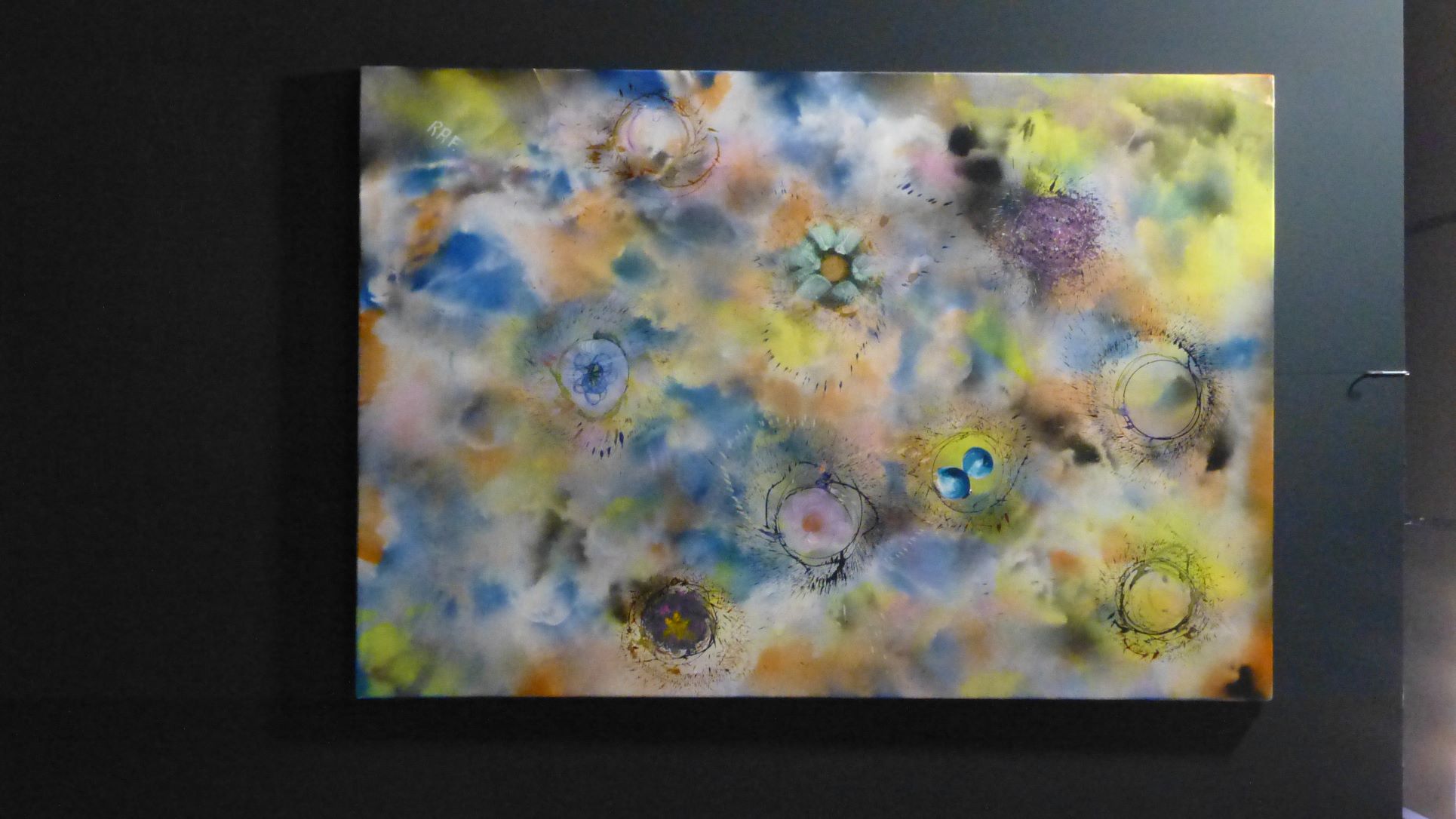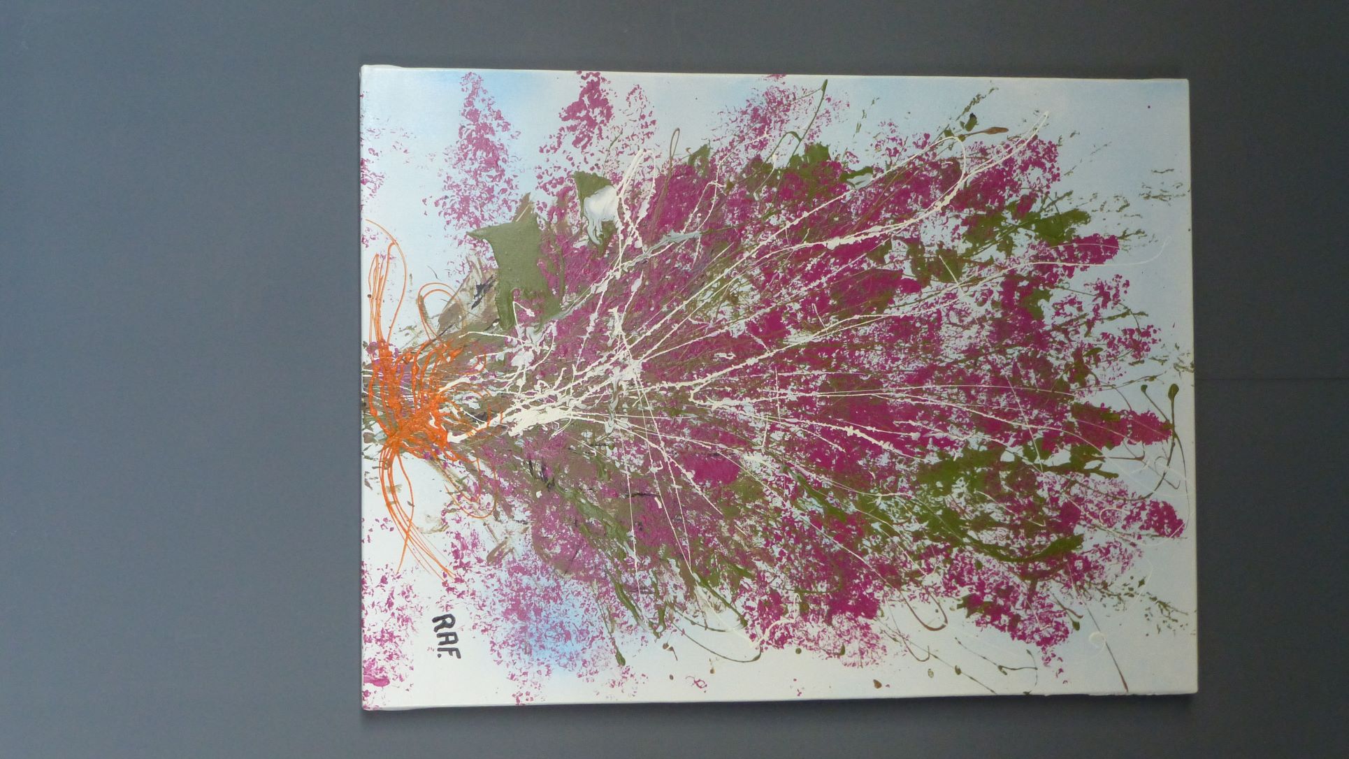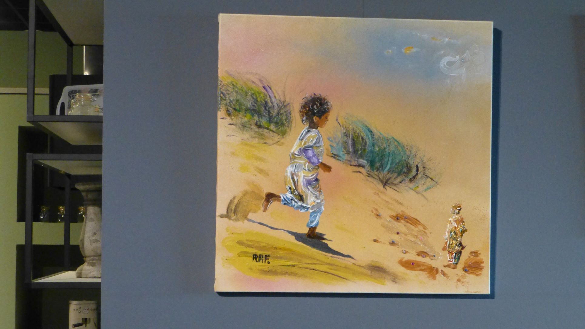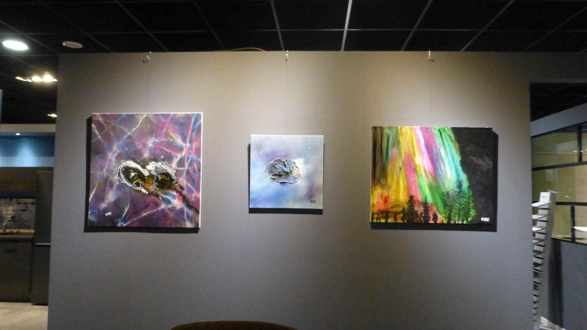 Exposition de 16 œuvres de RAF pour le 3ème anniversaire du magasin, à la demande d’un voisin propriétaire du magasin. Photos et titres des œuvres. Gros succès de la fête, de nombreux visiteurs. Visite cuisines et tableaux en décoration.
