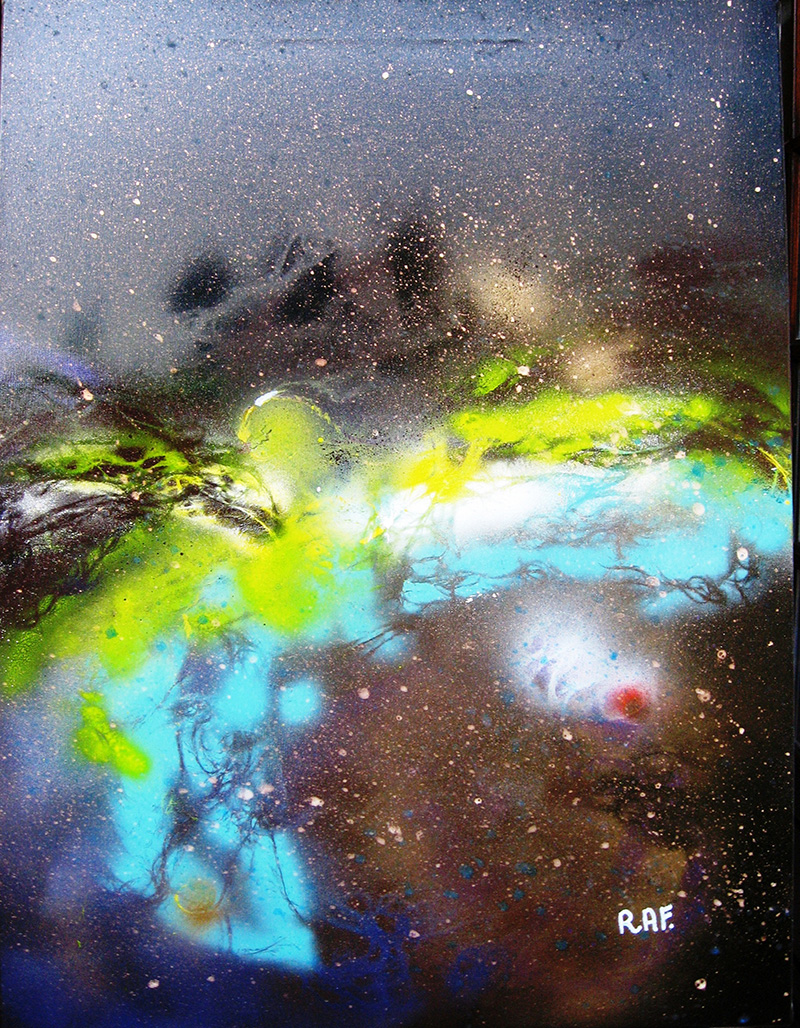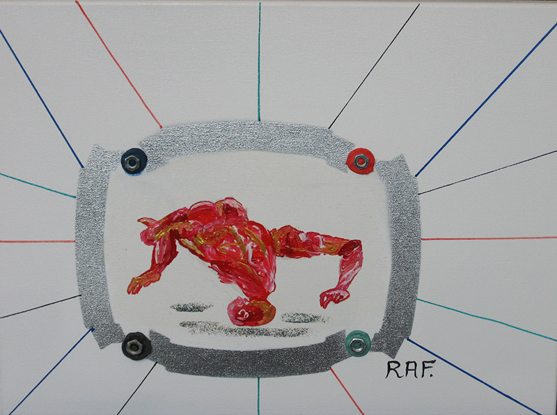 "Holocauste"(19.06.05). Poème de RAF. noté au dos du tableau. Peur claquemurée au fond de visages blêmes, les yeux cramponnés par-delà les cieux, visages pétrifiés aux yeux démouchetés dans l'éclosion des cris, ou visages de silence, efflanqués, au regard de fleurs rouges embusqués dans la ligne des cils; visages en file d'attente vers l'holocauste, identiques dans la peur hypnotique, visages inapaisés, images sacrifiées . RAF. -In Memoriam-