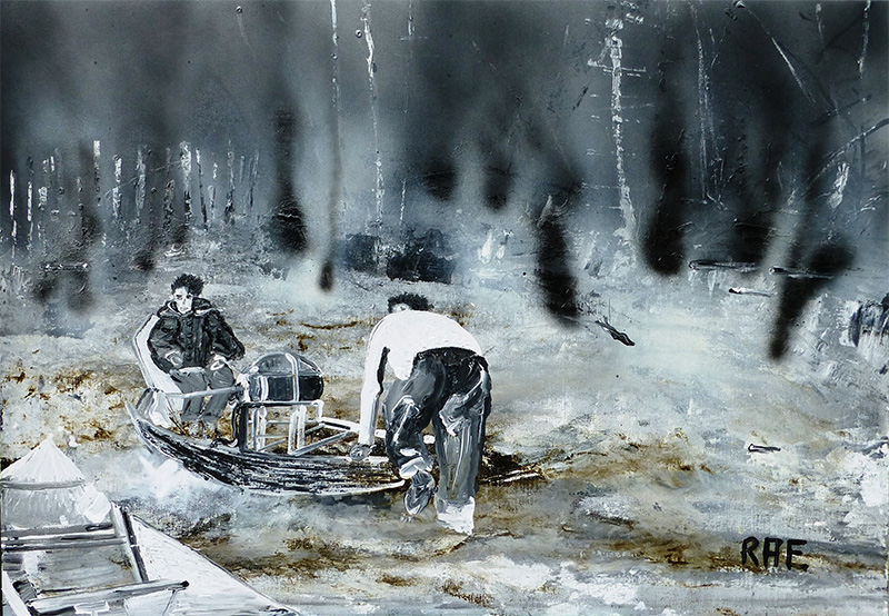 Sikhote Alin - Russie Sibérie Orientale -CHASSEURS DE MÉTÉORITES TRAVERSANT LES MARAIS - Dimensions 116x81.jpg - Dimensions 116 x 81